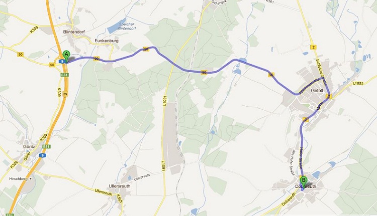 Die Bundesautobahn 9 an der Abfahrt Bad Lobenstein / Gefell verlassen. Über die B 90 nach Gefell und anschließend auf der B 2 Richtung Hof bis Dobareuth (insgesamt ca. 8 Kilometer). Der Wettkampfplatz befindet sich direkt an der Bundesstraße.